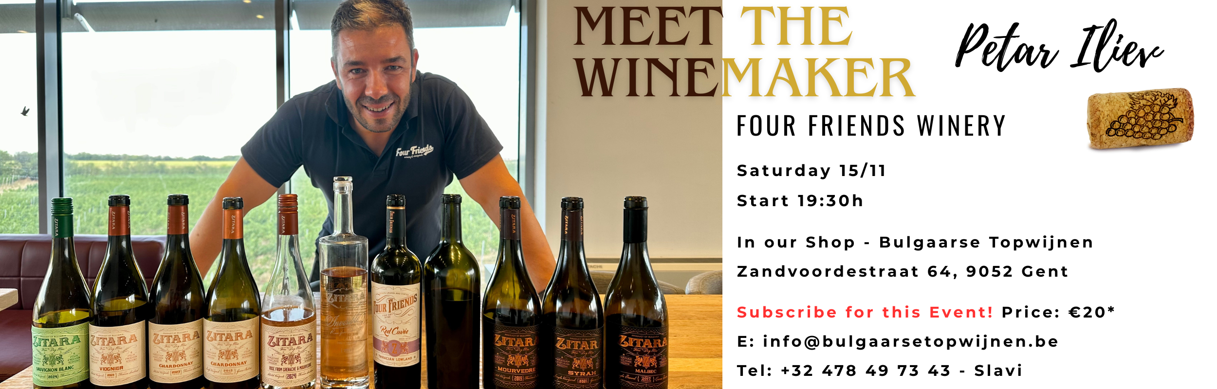 Four Friends is in de voorbij decennia gegroeid tot een van de meest toonaangevende en invloedrijke wijndomeinen van Bulgarije. Met Peter Iliev als oenoloog sinds 2013 heeft Four Friends de voorbije jaren de top bereikt en viel vele malen in de prijzen van verschillende jury’s zoals Divino BG, Balkan International Wine Competition, Decanter... Een unieke kans dus om hun topwijnen uit de Thracische vallei te ontdekken.